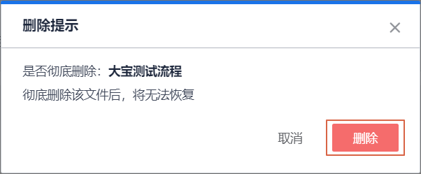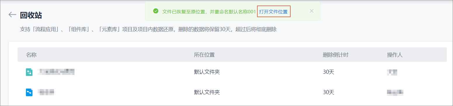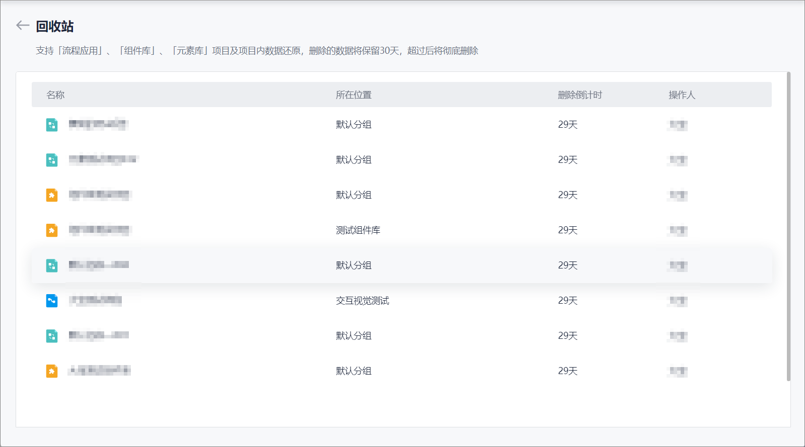 流程应用、组件库及元素库中项目删除后,将暂存于回收站中,您可以恢复或彻底删除指定项目。