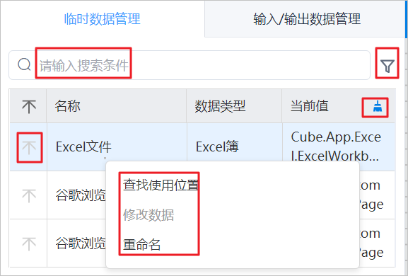 临时数据管理针对的是流程中组件输出的暂存数据(变量),您不仅可以查看变量的名称、数据类型、当前值,还可以对变量进行以下操作: