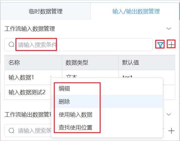 输入输出数据管理支持工程输入输出数据管理和工作流输入输出数据管理,工程输入输出数据可在主工作流中使用,工作流输入输出数据仅可在当前工作流中使用。除支持的数据类型不一致外(工程输入输出数据支持数值、文本、布尔值、日期时间四种类型,工作流输入输出数据支持全量数据类型),两种输入输出数据涉及的操作基本一致,本文以工作流级别输入输出数据为例为您介绍相关操作。
