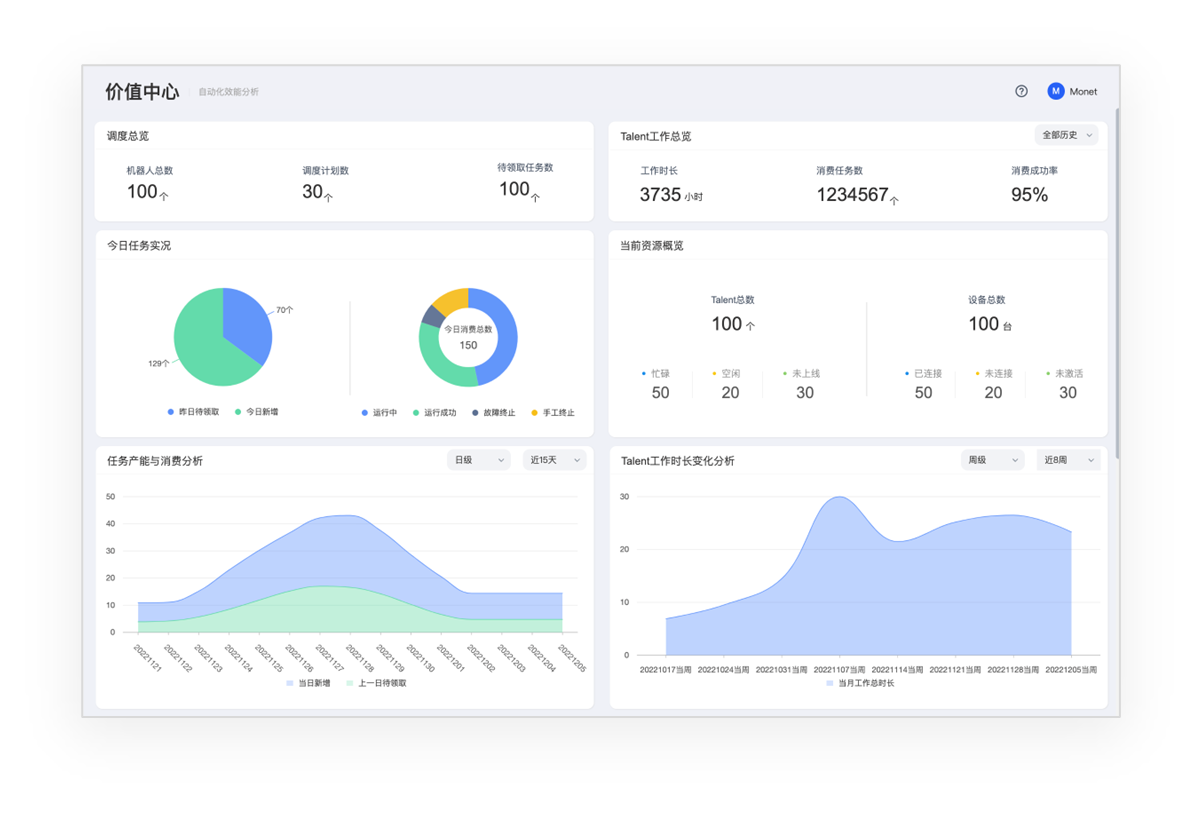 自动化效能分析及风险控制,对企业实施自动化的ROI进行持续、可视化的评估,校正自动化的推进方向;并对自动化在企业内的运行过程进行实时监控。