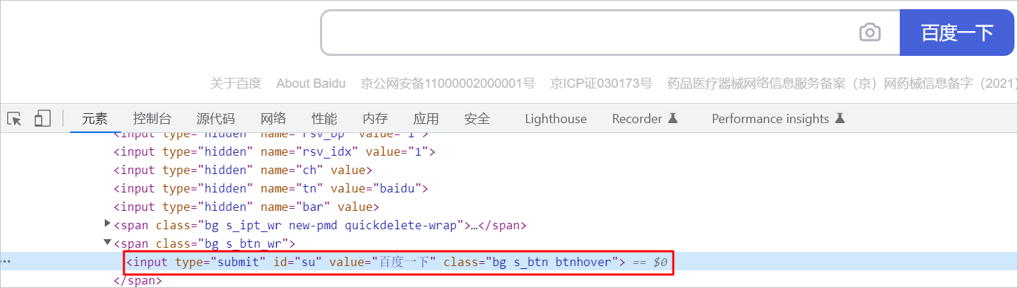 CSS选择器用于查找或选取要操作的网页元素,语法详情请参见CSS选择器 (opens new window)。以下以获取百度首页百度一下元素的CSS选择器为例为您介绍如何快速获取CSS选择器: