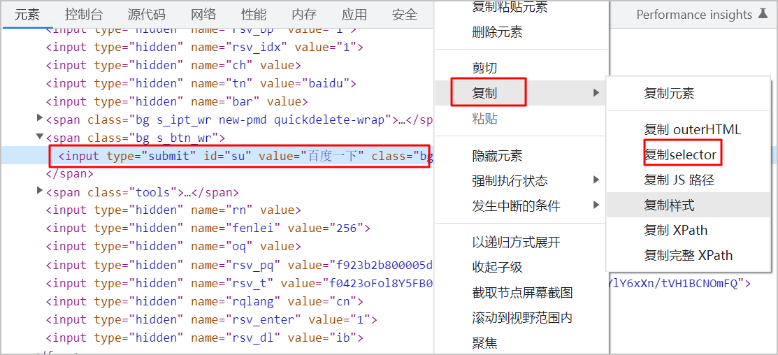 右击步骤3中的高亮代码行,选择复制>复制selector。