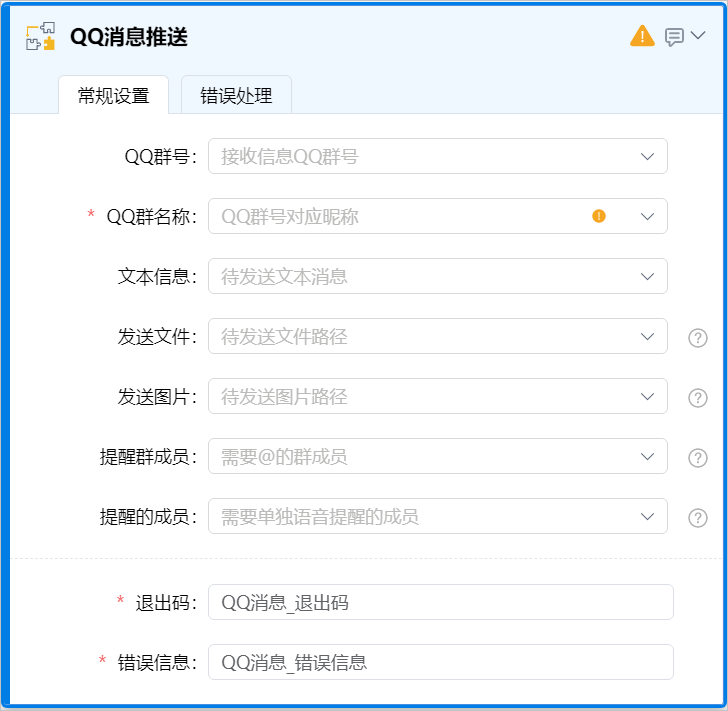 | 错误信息 | 是 | 将组件执行出错后的错误信息暂存为文本类型的变量,名称可自定义,默认名称为QQ消息_错误信息。 |