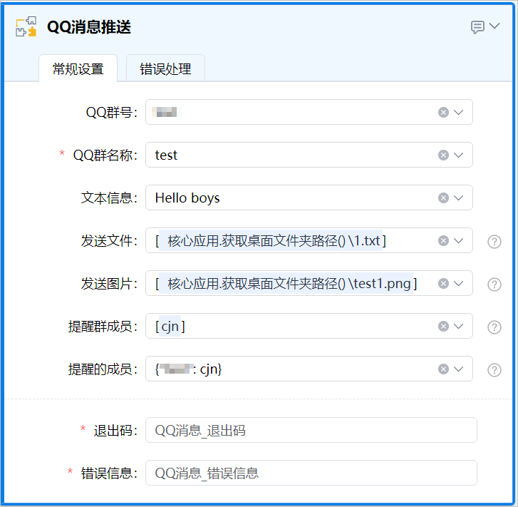 | 退出码 | 是 | 将组件执行完成后的退出码暂存为文本类型的变量,变量名称可自定义,默认名称为QQ消息_退出码,取值0表示正常,1表示异常。 |