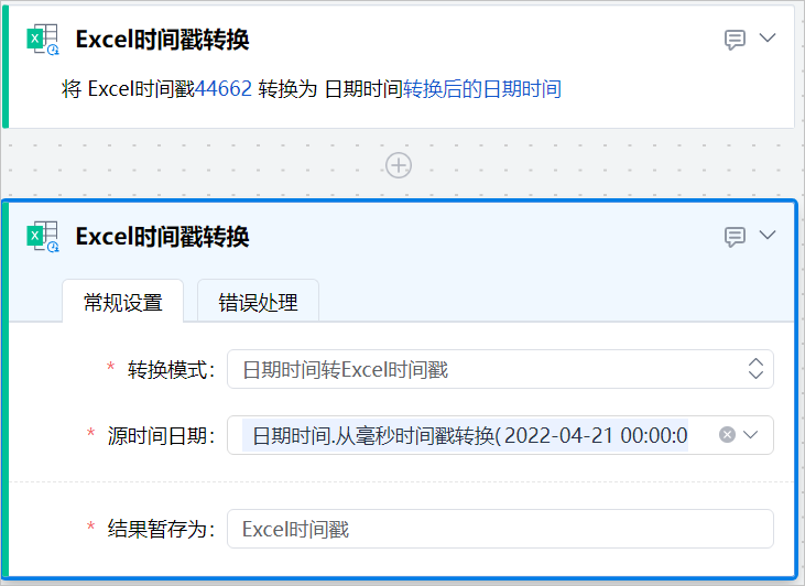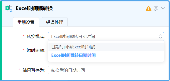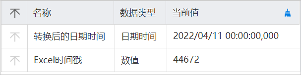 Excel时间戳转换组件可用于Excel时间戳与日期时间的相互转换,返回日期时间或数值类型的变量。
