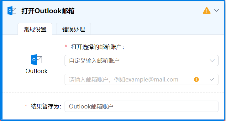 | 结果暂存为 | 将结果暂存为outlook账户类型的变量,名称可自定义,默认名称为Outlook邮箱账户。 |