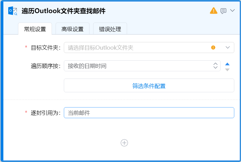 | 目标文件夹 | 要进行遍历的邮箱文件夹,支持Outlook邮箱账户对象、自定义表达式两种输入方式。 |