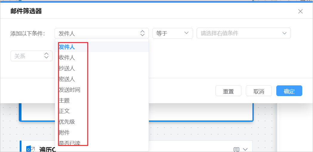 | 逐封引用为 | 将文件夹中的邮件暂存为流程中的Outlook邮件变量,名称可自定义,默认名称为当前邮件。 |